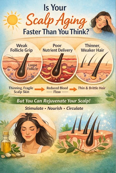 The scalp can age faster because it is often exposed to sun and stress, experiences reduced circulation, and receives far less care than the face. Over time, this can lead to thinner scalp skin, slower cell renewal, and less support for healthy hair growth.