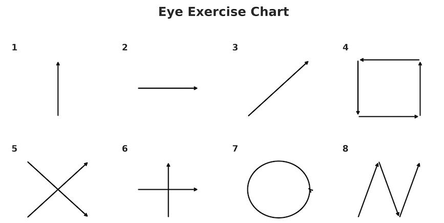 There are many charts on the internet with excellent eye exercises—some of them quite sophisticated. I haven’t tried those. Here, I’m showing only the very simple ones—the ones I do every day, 10 times each.