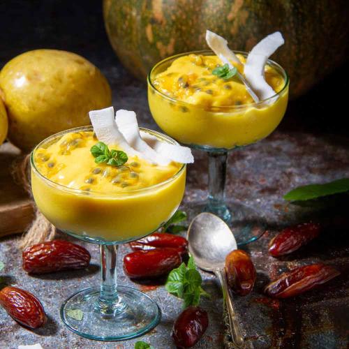 Blend cashews, water, coconut milk, Chia seeds, and dates at high speed for 3 minutes until smooth. Add spices (cinnamon, nutmeg, vanilla, cloves), blend for 1 minute, and serve over crushed ice.